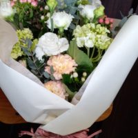 気がつくば、12月がさしせまってきましたね。先日淡い色で花束をということで、白、グリーン、淡いピンクの花を使って作らさせて頂きました。